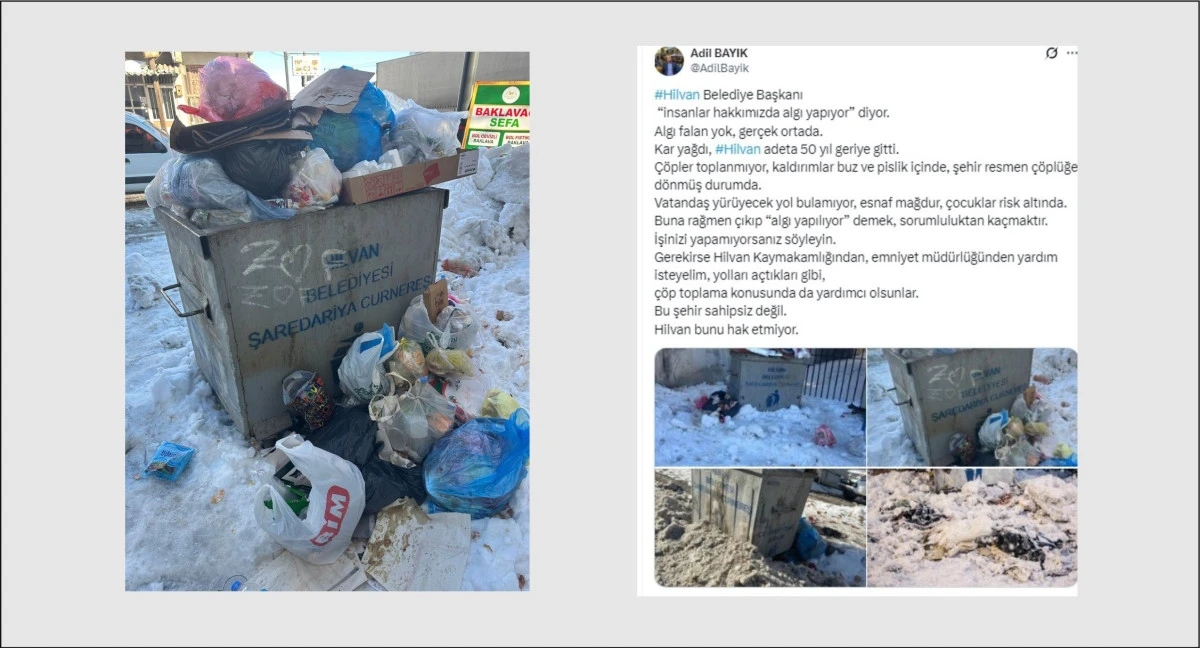 Şanlıurfa’nın Hilvan ilçesinde etkili olan kar yağışının ardından belediye hizmetlerinin durma noktasına gelmesi vatandaşları isyan ettirdi. Sokakların çöplüğe dönmesi, kaldırımların buzla kaplanması ve ulaşımın felç olması üzerine gelen eleştirilere Belediye Başkanı’ndan "algı" savunması gelince, Avukat Adil Bayık sessiz kalmadı.