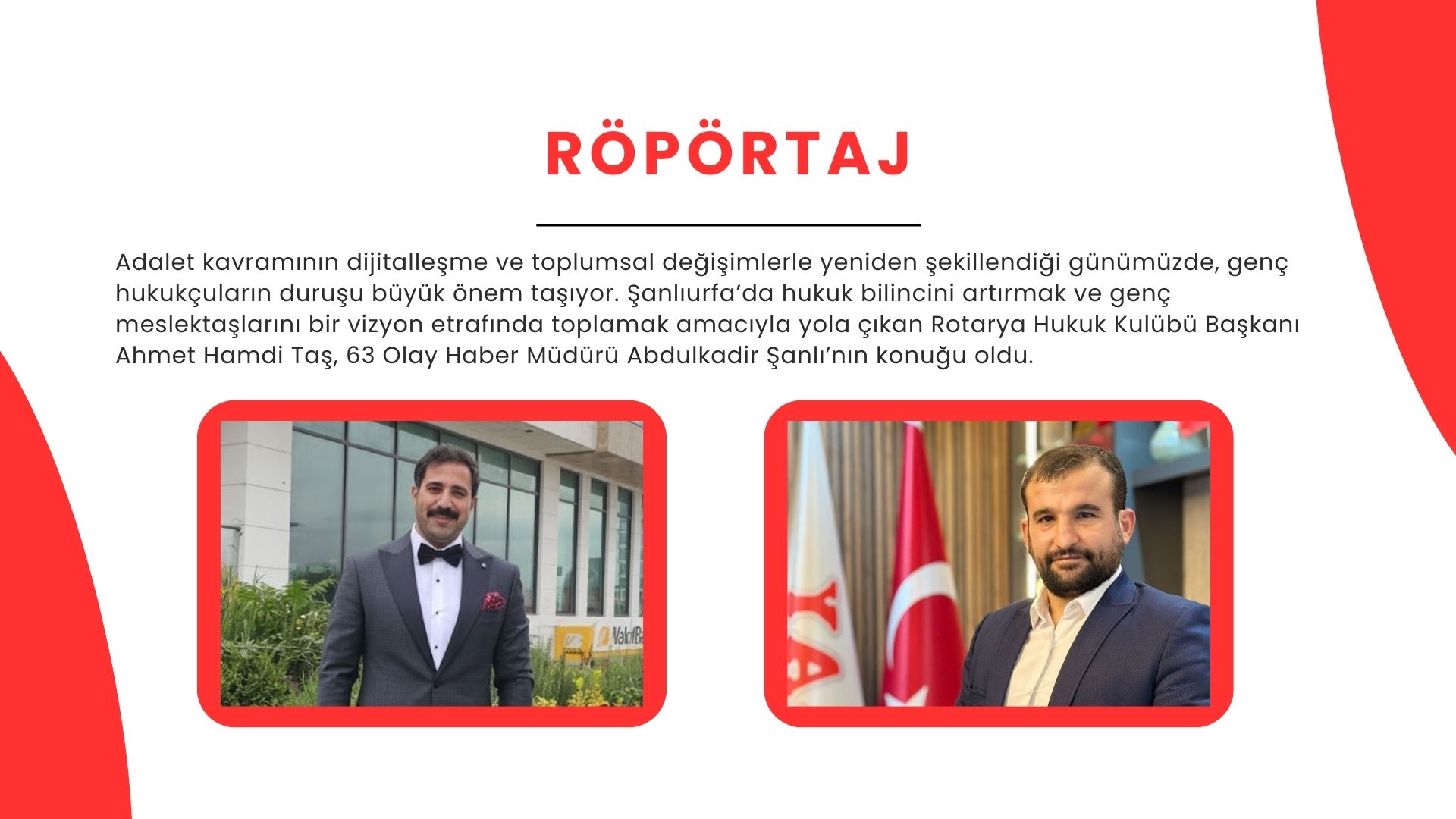 Şanlıurfa’nın güçlü haber kaynağı 63 Olay, hukuk dünyasının genç ve dinamik seslerini okuyucularıyla buluşturmaya devam ediyor. Haber Müdürümüz Abdulkadir Şanlı sordu; Rotarya Hukuk Kulübü Başkanı Ahmet Hamdi Taş, adaletin geleceğinden sosyal medya mahkemelerine kadar ezber bozan açıklamalarda bulundu.