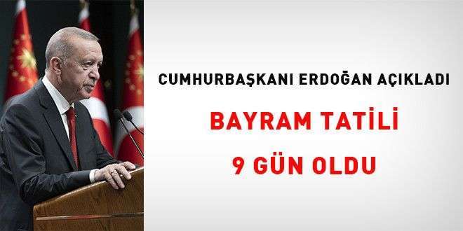 Erdoğan, milyonların merakla beklediği bayram tatiliyle ilgili "Kamu çalışanlarımız için 16 Haziran Pazar günü başlayacak Kurban Bayramı sonrasındaki 2 günlük süreyi de idari izin kapsamına aldık." dedi. "Perşembe ve cuma günlerini de bayram tatiline ekleyerek 9 günlük bir tatil imkanı sağlamış oluyoruz." ifadelerini kullanan Erdoğan, kamu çalışanlarının yapacağı tatili bildirdi.
