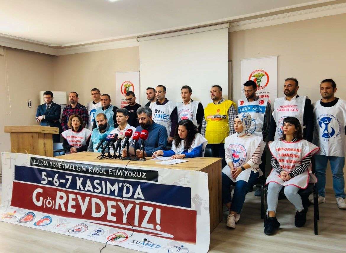Bunun ardından ülke genelinde hekimler 5-7 Kasım tarihleri arasında iş bırakacaklarını açıklamıştı. Şanlıurfa’da da 10 sendika ortak basın açıklaması düzenleyerek 3 gün boyunca iş bırakacaklarını açıkladı. Şanlıurfa Tabip Odası binasında yapılan basın açıklamasına, Birinci Basamak Sağlık Çalışanları Birlik ve Dayanışma Sendikası (BDS), Birlik Sağlık ve Sosyal Hizmet Çalışanları Sendikası (Birlik Sağlık-Sen ), Genel Sağlık ve Sosyal Hizmet Kolu Kamu Çalışanları Sendikası (Genel Sağlık-İş), Hekim Birliği, Sağlık ve Sosyal Hizmetler Çalışanları Sendikası (Hekim Birliği), Hekim ve Diğer Sağlık Çalışanları, Kamu Sağlık ve Sosyal Hizmetler Sendikası (HekimSen), Hürriyet Sağlık ve Sosyal Hizmetler Çalışanları Sendikası (Hürriyet Sağlık Sen), Sağlık ve Sosyal Hizmet Emekçileri Sendikası (SES), Şanlıurfa Aile Hekimleri Derneği ( ŞUAHED ), Şanlıurfa Tabip Odası ( ŞTO ) ve Tabip ve Diğer Sağlık Çalışanları Sağlık ve Sosyal Hizmetler Kamu Görevlileri Sendikası (Tabip-Sen) katıldı. Basın açıklamasını sendikalar adına Kemal Yüksekkaya okudu. “SAĞLIK SORUNLARI YENİDOĞAN SKANDALIYLA DAHA GÖRÜNÜR OLMUŞTUR” Yenidoğan skandalına değinen Yüksekkaya, “Bizler, her gün yüzbinlerce vatandaşımızı sağlığına kavuşturmak, hastalanmalarını önlemek için aile sağlığı merkezlerinde aralıksız çalışan hekimlerin, sağlık çalışanlarının örgütleri olarak; sağlık sisteminde yaşanan ve yenidoğan skandalı ile görünür hale gelen büyük sorunları görüyor biliyoruz. Henüz yenidoğan skandalı ortaya çıkmadan önce 14 Ekim’de bakanlığın hazırlamakta olduğu Aile Hekimliği Performans ve Ödeme Yönetmeliği’nin bu sorunlara çözüm olmayacağını, “sorunlar yumağına dönüşmüş sağlık sisteminin düzeltilebilmesinin yolunun birinci basamak sağlık hizmetlerinin ve koruyucu hekimlik uygulamalarının güçlendirilmesi” olduğunu hem her kademeden bakanlık yetkililerine hem kamuoyuna duyurmuştuk. Yönetmeliğin eksik, hatalı yönlerini ve çözüm önerilerimizi bakanlık yetkilileri ile yaptığımız görüşmelerde iletmiş ve 19 Ekim’de Ankara’da düzenlediğimiz mitingle taleplerimiz konusunda kararlılığımızı ifade etmiştik. Ancak bakanlık tüm uyarı, öneri ve eleştirilerimizi duymazdan gelip 1 Kasım  itibariyle yönetmeliği yürürlüğe soktu.” dedi. “SORUNLARIN BÜYÜKLÜĞÜ KAVRANMAMIŞ” Yönetmelikte yer alan maddeleri hekimleri zor durumda bıraktığını aktaran Yüksekkaya şu ifadeleri kullandı: “Sağlık Bakanlığı’nın sağlık alanında yaşanan ciddi sorunları çözmek için birinci basamak sağlık hizmetlerini ve koruyucu hekimlik uygulamalarını güçlendirecek yapısal düzenlemeler yapmak yerine; “Performans ve Ödeme Yönetmeliği” ile ödeme üzerinden değişiklikler yapmaya çalışması sorunların büyüklüğünün kavranamamış olduğunu göstermektedir. Yürürlüğe giren bu yönetmelik halkın sağlığına ve hekimlerin, sağlık emekçilerinin haklarına bir katkı sağlamayacaktır. Zira bu yönetmelik; · Koruyucu sağlık hizmetlerinin geliştirilmesine yönelik gerekli düzenlemeleri içermemektedir. · Hastalara ve koruyucu hekimlik uygulamalarına yeterli zaman ayrılabilmesine fırsat vermemektedir. · Kendi içinde taşıdığı çelişkili uygulamalar ile hekimlerle hastaları karşı karşıya getirerek şiddete zemin hazırlamaktadır. · Belli ilaç gruplarının reçetelenmesi ve sevkleri sınırlayarak hekim bağımsızlığına müdahale etmektedir.  · Karmaşık hesaplamalar ile ulaşılması mümkün olmayan, ulaşılsa bile halk sağlığı için faydasız performans kriterleri içermektedir. · Yapılan işin kalitesine değil sayısına değer vermektedir. · Hekimlerin ve aile sağlığı emekçilerinin iş ve gelir güvencesini ortadan kaldırmaktadır. · Aile sağlığı merkezinde mevcut ebe ve hemşire eksikliğini gidermek şöyle dursun artacak olan istifalar ile pek çok birimin geçici görevlendirmeler ile hizmete devam etmek zorunda kalmasına yol açacaktır.   Özetle bu yönetmelik, çalışma koşullarını eziyete dönüştürecek bir yönetmeliktir. Halkın sağlığını, hekimlerin ve sağlık çalışanlarının özlük hakları ve çalışma koşullarını iyileştirmek bir yana yaşanmakta olan sorunları daha da derinleştirecektir.”   HEKİMİMLERİN BEKLENTİLERİ Yüksekkaya hekimlerin beklentisine değinerek sözlerine şöyle devam etti: “Oysa halkın sağlığını koruyan, geliştiren, hekimlerin ve tüm sağlık emekçilerinin mesleki bağımsızlığının olacağı ve istekle çalışacağı, ülkemizin ihtiyacı olan bir birinci basamak sağlık hizmeti programını hayata geçirmek için yapılması gerekenler bellidir. Sağlık Bakanlığından “Performans ve Ödeme”nin karmaşık hesapları ile uğraşmak yerine aşağıdaki taleplerimizi yerine getirmesini istiyoruz: 1.Kamusal bir hizmet olan birinci basamak sağlık hizmetlerinin fiziki ve tıbbı donanımı ve aile sağlığı merkezleri kamu tarafından sağlanmalıdır. 2.Halkımıza nitelikli bir sağlık hizmeti sunabilmemiz için yeterli zaman ve olanak sağlanmalıdır. Koruyucu sağlık hizmetlerinin öncelendiği ve ekip anlayışını gözeten bir sistem inşa edilinceye kadar Aile Sağlığı Merkezi sayısı hekim başına 2.000 nüfusu aşmayacak şekilde artırılmalıdır. 3.Kadrolu ve güvenceli istihdam modeli ile yeterli hemşire, ebe, teknisyen görevlendirilmeli, aşılama ve diğer koruyucu hekimlik uygulamaları desteklenmeli, geliştirilmelidir. Kadrosuz, güvencesiz bir şekilde çalışan emekçiler (gruplandırma elemanları) kadroya geçirilmelidir. 4.Aile hekimlerine ve tüm sağlık emekçilerine emekliliğe yansıyacak tek kalemden oluşan, insanca yaşamaya yetecek düzeyde, izin kullandıkla