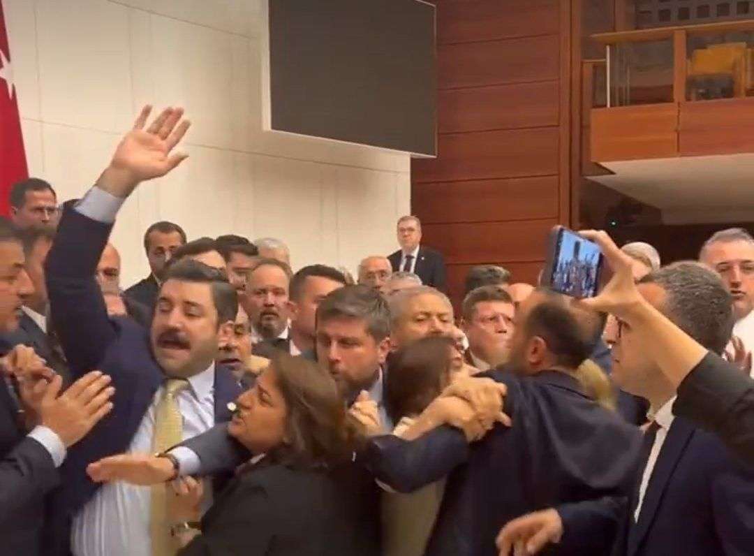 Türkiye Büyük Millet Meclisinde DEM Parti milletvekilleri protesto yapmak istedi. Hakkari Belediyesine atanan kayyum dolayısıyla tepki göstermek için toplanan DEM Parti Milletvekillerine Ak Parti Milletvekilleri sözlü tartışmada bulunduktan sonra biranda çıkan arbede sonucu yumruklar havada uçtu.